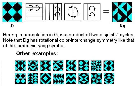 Let G be the group of 322,560 permutations of these 16 tiles generated by arbitrarily mixing random permutations of rows and of columns with random permutations of the four 2x2 quadrants. THEOREM: Every G-image of D (as at right, below) has some ordinary or color-interchange symmetry. Example: ![]() For an animated version, click here. |