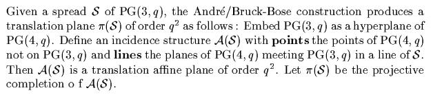 From Symplectic spreads (pdf):"First we give an overview of some definitions and theory of finite geometry, together with some results of the past which provide the context and background for our construction. A projective plane is an incidence structure of points and lines such that: (PP1) for every pair of distinct points there is a unique line which is incident with both of them; (PP2) every pair of distinct lines meet in a unique point; (PP3) there exist four distinct points with no three collinear (no three are incident with a common line). An affine plane is an incidence structure of points and lines such that: (AP1) for every pair of distinct points there is a unique line which is incident with both of them; (AP2) for any non-incident point-line pair p, L, there exists a unique line through p which has no point in common with L; (AP3) there exist three non-collinear points. In a projective or affine plane, a point P is a centre for a collineation phi if phi fixes every line incident with P. A line l is an axis of phi if phi fixes every point on l. It is standard knowledge that every non-identity collineation has at most one axis and at most one centre, and it has an axis if and only if it has a centre (see [7, Section 3.1.4]). A collineation which has a centre and axis which are incident with one another, is called an elation. A group of collineations H is called (P, l)-transitive if the subgroup of H consisting of those elements which have centre P and axis l, acts transitively on the non-fixed points of any line through P which is not equal to l. For two lines m and l, we say that H is (m, l)-transitive if H is (P, l)-transitive for all P on m. Dually, if P and Q are points, then we say that H is (P, Q)-transitive if H is (P, l)-transitive for every line l incident with Q. Let Gamma be a projective plane and suppose that Delta is an affine plane obtained by removing the line linfinity from Gamma. Then Delta is a translation plane if there exists a R. H. Bruck in 1951 [4] introduced finite nets. A net